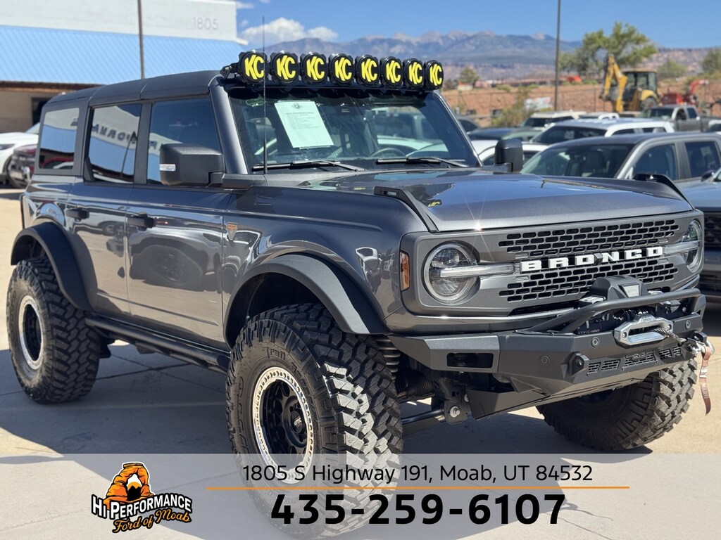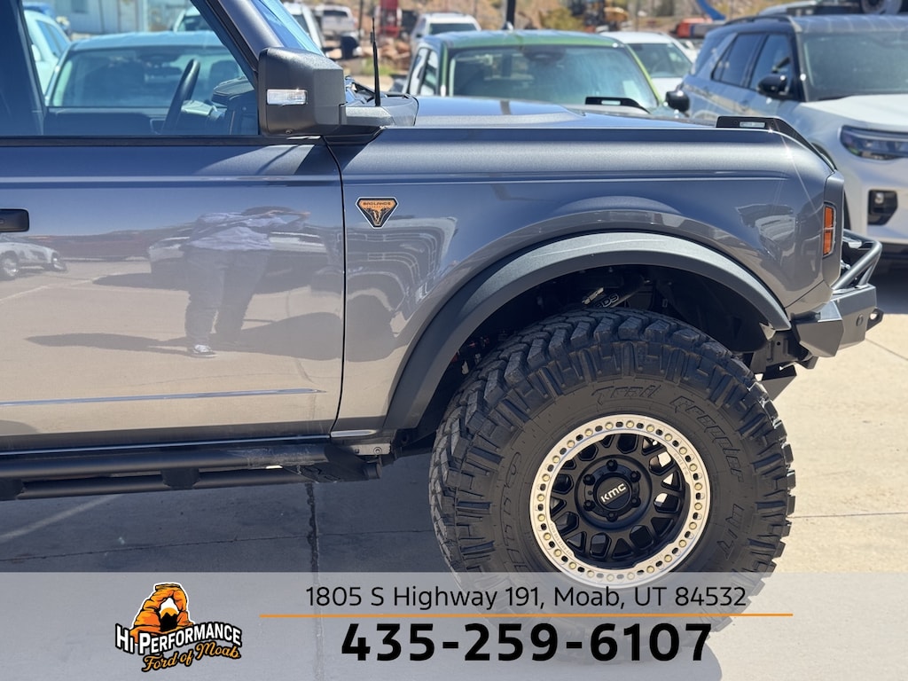 Carbonized Gray Metallic 2024 Ford Bronco Badlands 4WD 10-Speed Automatic 2.7L EcoBoost V6 Bronco Badlands, 4D Sport Utility, 2.7L EcoBoost V6, 10-Speed Automatic, 4WD, Black Onyx Vinyl, 10 Speakers w/Subwoofer, 2-Door Intelligent Access w/Lock/Unlock, 360-Degree Camera, 4.7 Final Drive Ratio, Adaptive Cruise Control, Additional Sound Deadening, Ambient Footwell Lighting, Auto-Dimming Interior Rear-View Mirror, Dr & Pass Illuminated Sliding Visor Vanity Mirrors, Dual-Zone Electronic Automatic Temperature Control, Equipment Group 334A High/Lux Package, Evasive Steering Assist, Front Parking Sensors, Front Row Heated Seats, Heated Steering Wheel, High Clearance Fender Flares, High Clearance Suspension, Information on Demand Panel, Position-Sensitive Bilstein Shock Absorbers, Power Outlet - Back Side of Center Floor Console, Radio: B&O Sound System by Bang & Olufsen, Rear Parking Sensors, Sasquatch Package, Sideview Mirrors, Universal Garage Door Opener, Wheels: 17" Black High Gloss-Painted Aluminum, Wireless Charging Pad.